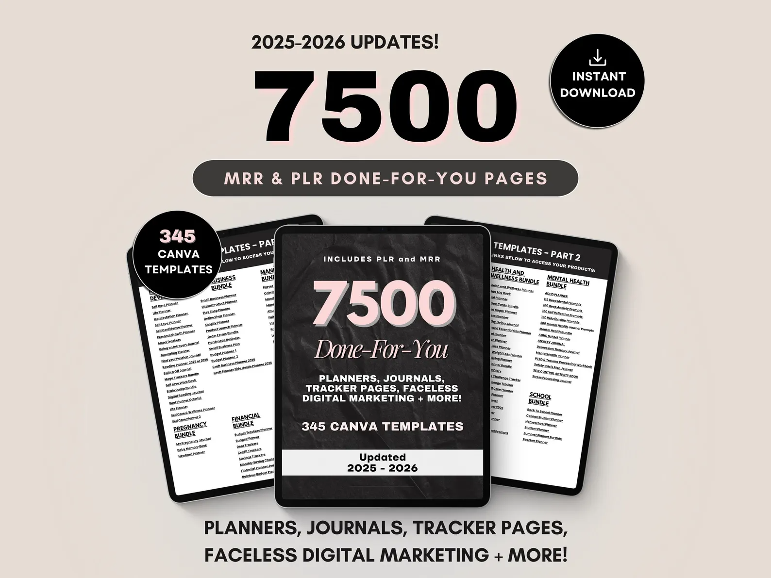 Développez, faites croître ou relancez instantanément votre activité de produits numériques grâce à ce pack exceptionnel de plus de 7 500 pages et 345 modèles . Conçu pour les entrepreneurs, les personnes qui exercent une activité complémentaire et les créateurs de contenu, ce pack vous offre l’opportunité de vendre des agendas, des carnets, des outils de suivi et bien plus encore, très demandés, sans passer des semaines à tout concevoir de A à Z.